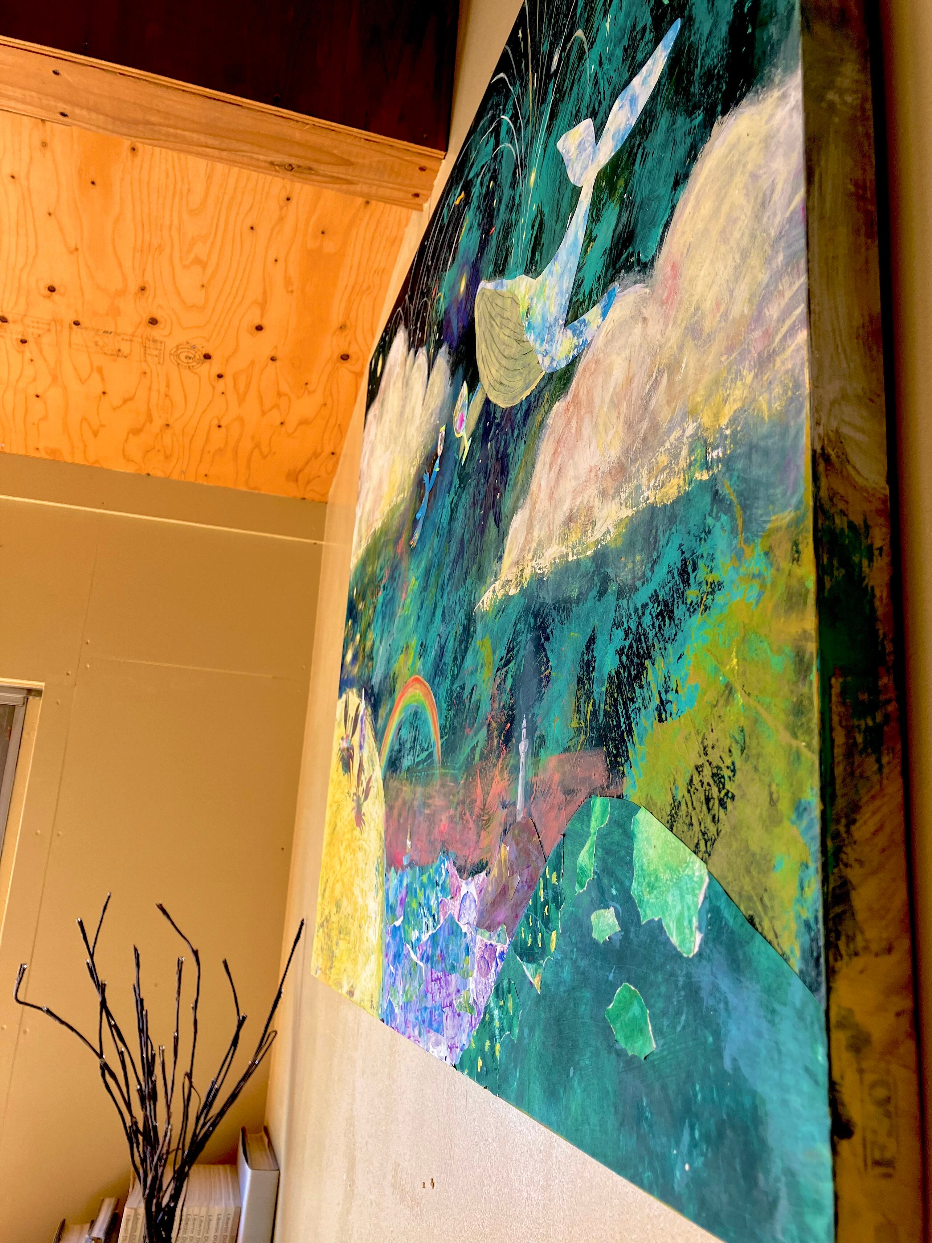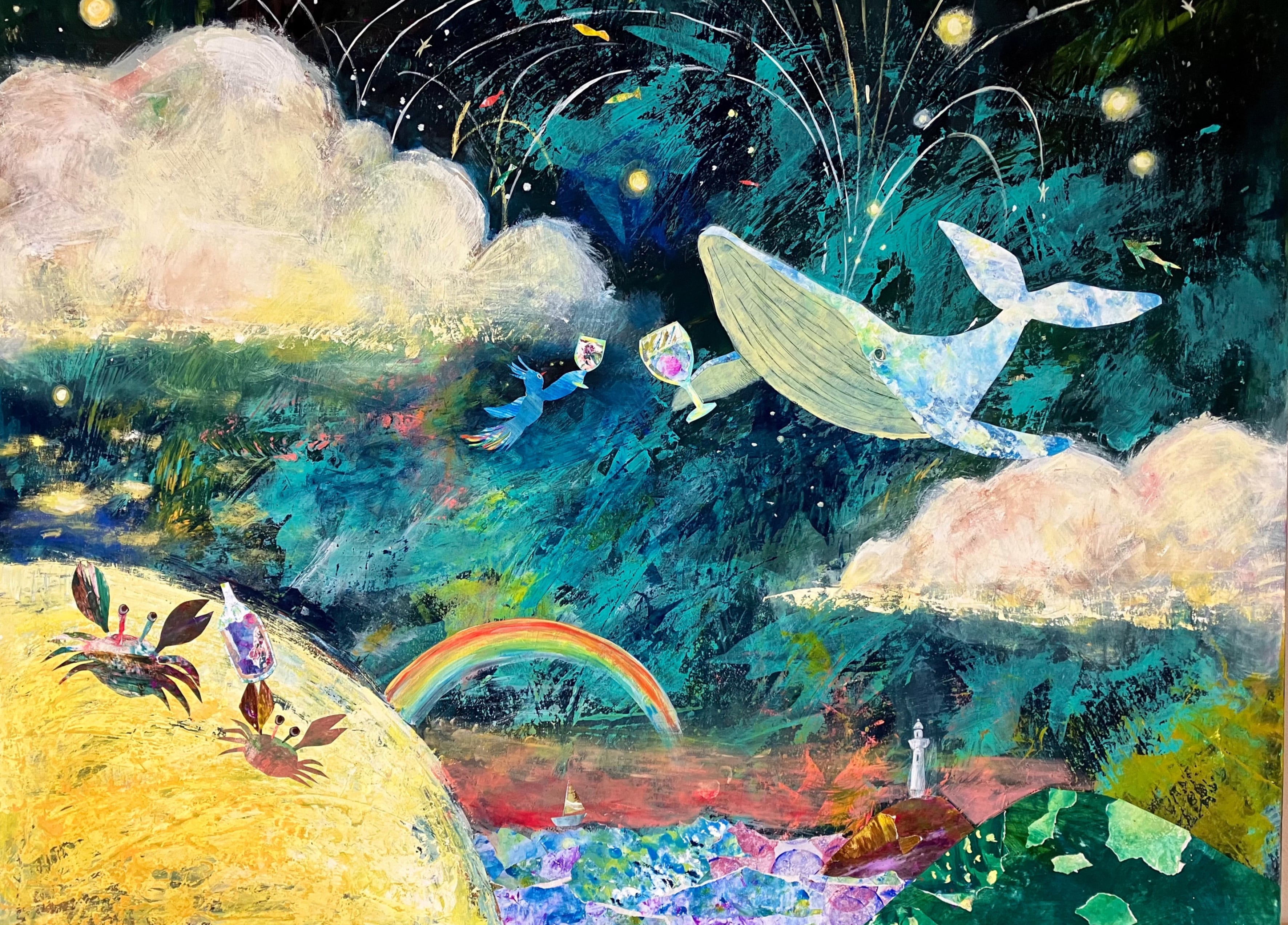 貼り絵によるモチーフや、絵の具の重なり、