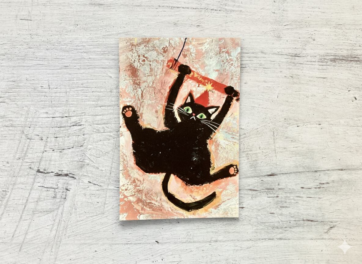 黒猫が空中ブランコで七転び八起きしているポストカード。